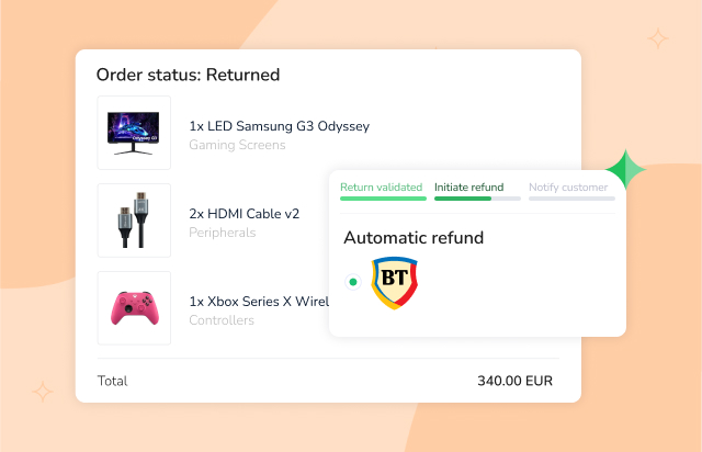 Prin aplicatia BT Ultra iti conectezi magazinul cu solutia de tip Internet Banking pentru companii dezvoltata de Banca Transilvania, pe care o poti utiliza pentru initierea automata de rambursuri catre clienti.Dupa instalarea aplicatiei, este necesara setarea unor fluxuri de lucru (Ex: pe baza statusului comenzilor, statusurilor de plata, tag-urilor de pe comenzi etc), in urma carora se va declansa initierea automata de rambursuri. Pentru setarea acestor fluxuri, te rugam sa ne contactezi.