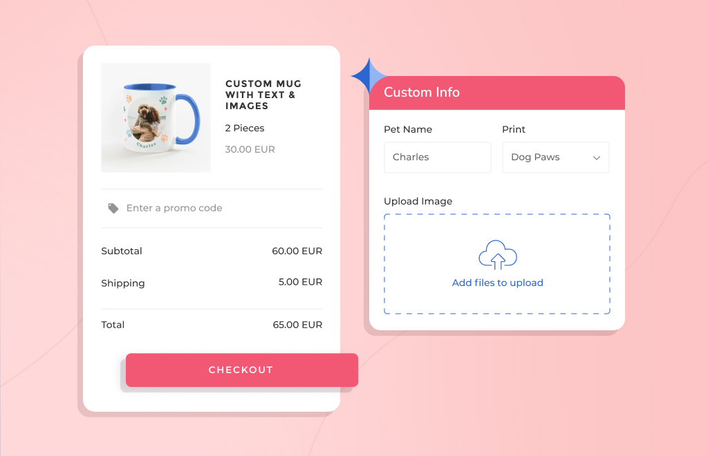 Aplicatia iti permite sa vinzi produse personalizate in cadrul magazinului. Defineste tipul de continut acceptat (text sau fisier) pentru customizarea produselor, iar clientii tai vor putea sa adauge continutul de personalizare direct din magazin, in pagina de produs.Poti accepta personalizarea cu texte sau imagini pentru orice articole doresti, de la cani si tricouri personalizate, pana la piese de mobilier.
